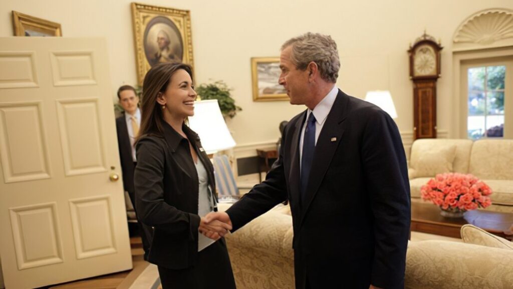 Fotoğrafta eski ABD Başkanı George W. Bush ile Maria Corina Machado görülüyor. O yıllarda Venezuela’da yapılan seçimleri denetlemek için Amerika tarafından kurulup finanse edilen bir “bağımsız, demokratik sivil toplum grubu” oluşturulmuştu. Bu gurubun yasal temsilciliğini Sümate’ adlı kurum yapıyordu. Maria Corina Machado da bu örgütün lideriydi.