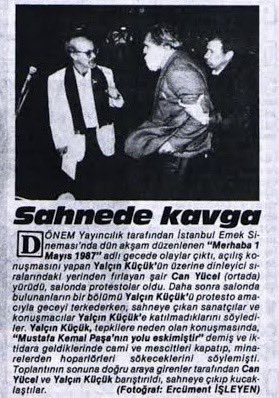 Yalçın Küçük sahneye çıkınca “Mustafa Kemal Paşa’nın yolu eskimiştir. Biz iktidara gelince minarelerden hoparlörleri sökeceğiz.” gibi laflar edince orada bulunan Can Yücel sahneye fırlayarak Yalçın Küçük’ün üstüne yürümüş ve Minareler senin gö..ne girsin.” diyerek tepki göstermiş.